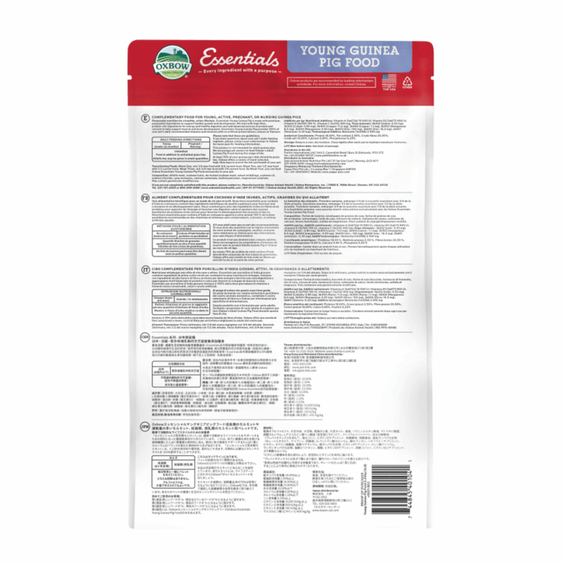 Al Alimento Essential para Cuy Joven de Oxbow, no es necesario añadirle vitaminas ni minerales extra. Solo complementa con heno fresco de alfalfa (hasta los 6 meses) y agua limpia, y tu pequeño estará completamente nutrido.